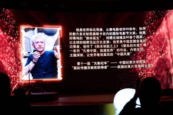 在本届“光影纪年”颁奖盛典上,组委会向柯文思导演颁发“国际传播贡献奖”时,颁奖词里说到:“他以全球的视野见证历史发展;他更是中国发展变革的记录者,创作了《柴米油盐之上》《善良的天使》等一系列‘扎根中国,连通世界’的作品,内容生动,主题深刻,让世界看到真实的‘中国风景’。”