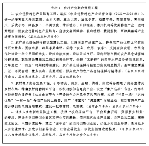 2.培育壮大乡村特色产业。充分发挥我省山地、丘陵、平原、沿河、沿湖、沿海等资源禀赋,重点发展小杂粮、中药材、特色果蔬、茶叶、特种养殖等具有地方特色的优势产业,培育农业特色产业“单项冠军”,打造一批特色产业全链条典型模式,培育一批农业“链主”企业。创新发展具有民族和地域特色的乡村手工业,围绕“原字号”开发市场适销对路的新产品。推动特色产业品种改良、品质提升、品牌打造,建设一批富有特色、规模适中、辐射带动力强的特色产业集聚区。(省农业农村厅牵头,省自然资源厅、省畜牧局、省工业和信息化厅、省文化和旅游厅配合)