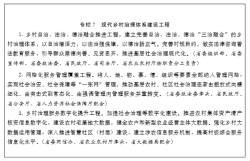 3.提升乡村法治水平。编制实施“八五”普法规划,开展“法律进乡村(社区)”活动,广泛宣传与农民群众生产生活密切相关的法律法规。实施农村“法治带头人”培育工程,加强民主法治示范村(社区)建设,实现每个村(社区)有一处法治文化阵地。健全农村公共法律服务体系,抓好“村(居)法律顾问”工作,推进村(社区)司法行政工作室建设。建立健全农村地区扫黑除恶常态化机制,依法加大对农村邪教活动打击力度。深化农村社会治安防控体系建设,强化网格化管理,提升农村治安防范治理水平。(省委政法委牵头,省司法厅、省公安厅配合)