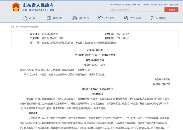齐鲁网·闪电新闻12月31日讯 12月31日,山东省人民政府网站下发《山东省“十四五”推进农业农村现代化规划》通知。通知提到,充分发挥新旧动能转换综合试验区优势,树立大数据经济战略资源理念,全面提升农业质量效益和竞争力,全面提高农村生产、生活、生态质量。
