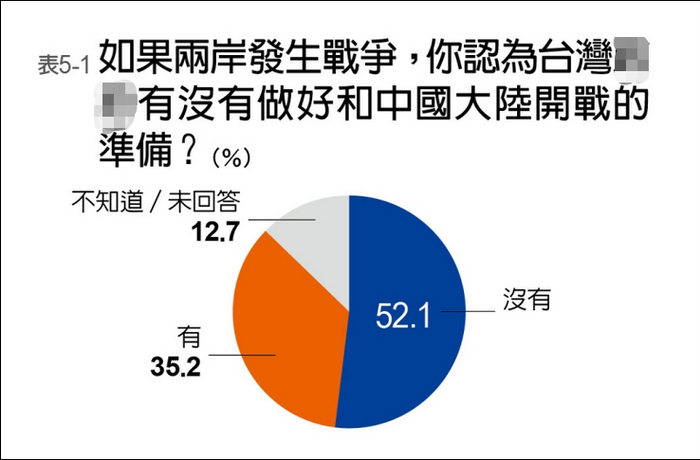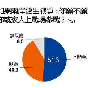 调查显示,若两岸开战,有高达52.1%的受访者认为,民进党当局“没有做好和中国大陆开战的准备”,有51.3%的人“不愿意亲自上战场或让家人上战场”。值得一提的是,从年龄段来看,20至29岁区间不愿意上战场的比例最高,高达70.2%。