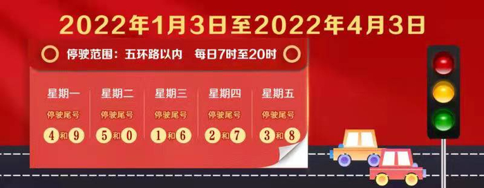 1月3日,北京市将迎来新一轮限行尾号轮换。自2022年1月3日至2022年4月3日,星期一至星期五机动车限行车牌尾号分别为:4和9、5和0、1和6、2和7、3和8。