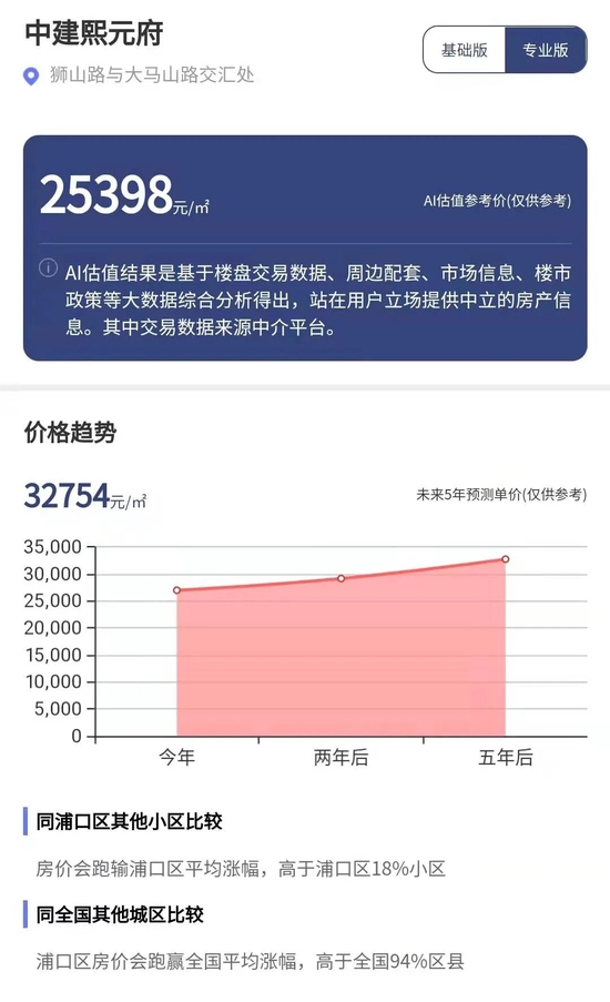 再以浦口区的中建熙元府项目为例,在第三方平台,该项目当前销售均价约为27500元/平方米。每经AI品房小程序综合综合评估显示,中建熙元府项目估值参考价为25398元/平方米。