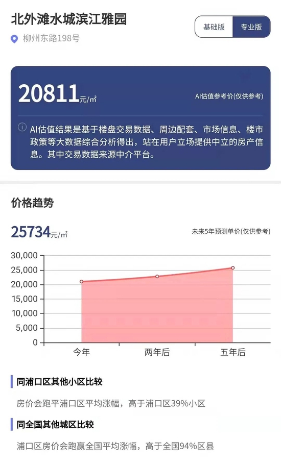 南京另一热门区域浦口区的北外滩水城•滨江雅园项目,目前销售均价为21525元/平方米 。每经AI品房小程序综合评估显示,其估值参考价为20811元/平方米,但未来五年的房价涨幅高于海玥万物。