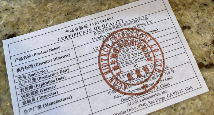 (观察者网讯)当地时间2021年12月31日(北京时间2022年1月1日凌晨3时),前不久因为全家持枪迎圣诞的照片“火”了一把的美国众议员托马斯·马西(Thomas Massie),在推特展示了中国制造的新冠病毒家用检测试剂盒,还给了产品中文合格证一张特写,强调中国产的试剂盒已在美国被广泛授权使用,“this is fine”(行吧)。