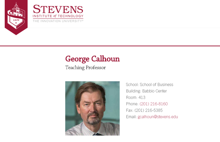 这个美国教授名叫George Calhoun,是美国斯蒂文斯理工学院(Stevens Institute of Technology)的一名授课教授,其本职专业是无线通讯科技和资本市场融资。