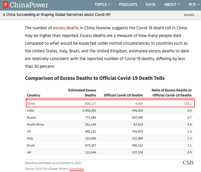 (图为《经济学人》杂志仍在其网站上使用着错误的大数据模型,误导舆论大众以为中国瞒报了上百万人的死亡人数)