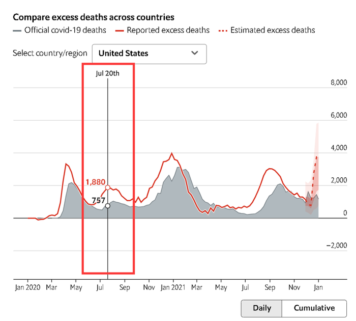 因为,《经济学人》认为当天美国的“实际死亡人数”应该在1880人(当天美国通报的死亡人数为757人)。