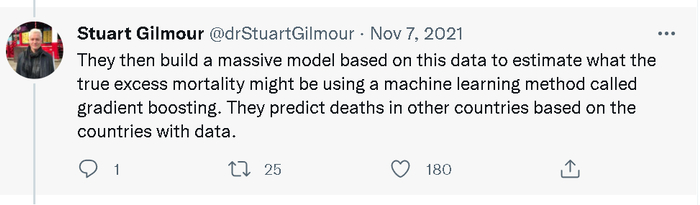 其中,日本圣路加国际大学(St. Luke's International University, Japan)的生物统计学教授Stuart Gilmour就连发了20多个贴文,详细指出了《经济学人》这个新冠疫情“实际死亡人数”的大数据模型和人工智能推算系统在推算中国和越南等采取严格防疫措施的亚洲国家时存在的严重误差以及这种误差的由来。