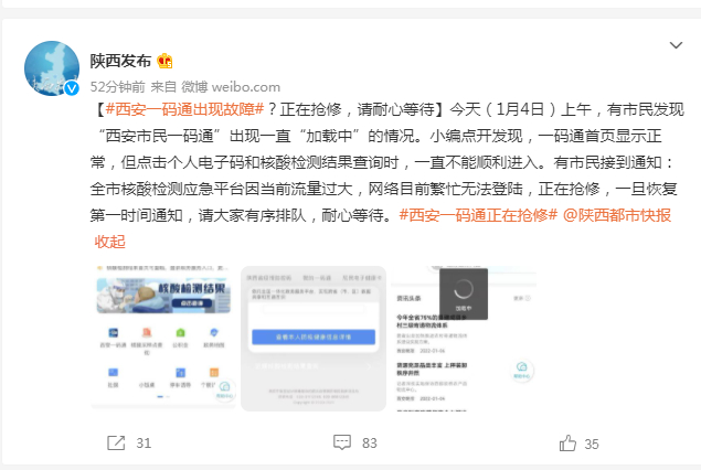 据陕西发布微博称,全市核酸检测应急平台因当前流量过大,导致网络繁忙无法登陆。