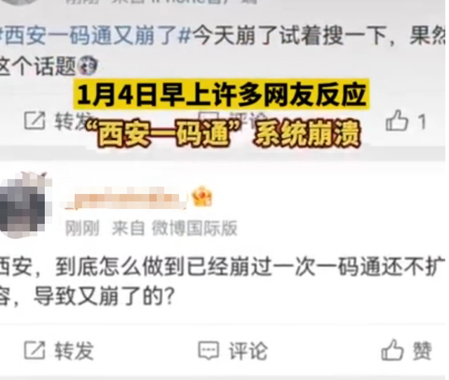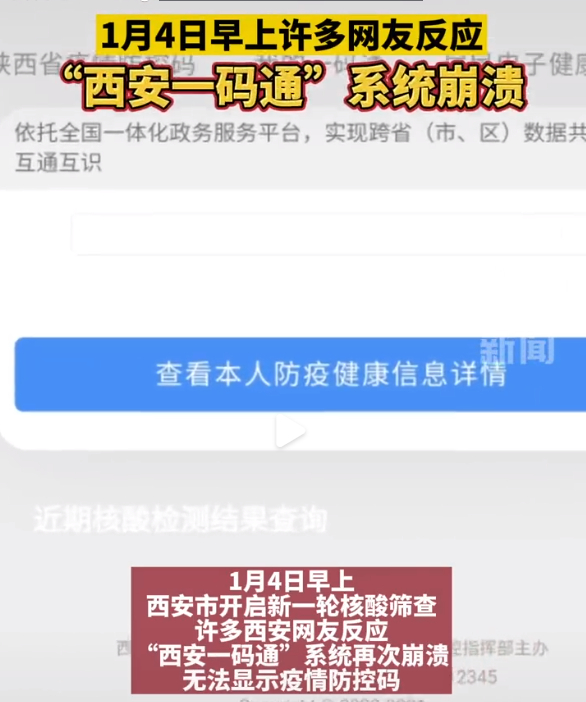 据西部网微博消息,今天(1月4日)9时,西安市疫情防控指挥部决定启动全市新一轮核酸筛查工作。9时许,不少市民反映,“西安一码通又崩溃了”,核酸检测无法进行。
