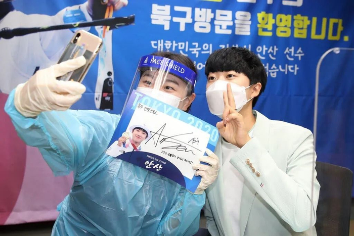 这些男性活动人士瞄准了任何带有女权主义味道的东西。比如,他们迫使一所大学取消一名女性的演讲,指责后者散布厌男言论;他们诋毁在东京奥运会上获得3枚金牌的韩国著名女子射箭运动员安山(下图),因为她留着一头短发;他们还把矛头对准促进女权主义议程的政府,迫使有关总统候选人承诺改革韩国已设立20年的性别平等与家庭事务部。