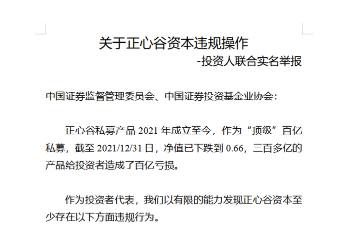 网传举报信在开头指出:“正心谷私募产品2021年成立至今,作为‘顶级’百亿私募,截至2021/12/31日,净值已下跌到0.66,三百多亿的产品给投资者造成了百亿亏损。”