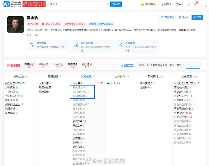 原标题:罗永浩限制高消费信息清零,目前仅存股权冻结信息