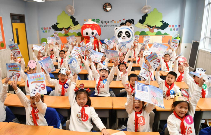 1月4日,在太原市新建路小学,小学生们展示自己闯关答题的成绩单。新华社记者 柴婷 摄