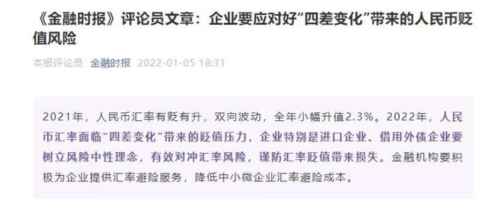 人民币汇率也突然遭遇警示。1月5日傍晚,中国人民银行主办的《金融时报》官微突然发表评论称,企业要应对好“四差变化”带来的人民币贬值风险。这四差变化是:本外币利差缩小、经济增长差变化、对外贸易差缩小、风险预期差逆转。这四差分别对应的又是美国加息对中美利差的影响,美国经济增速加快促进美元汇率走强,疫情缓解致使中国出口回归常态,以前美股出现风险引发资金外流。