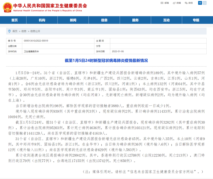 1月5日0—24时,31个省(自治区、直辖市)和新疆生产建设兵团报告新增确诊病例189例。其中境外输入病例57例(上海20例,广东10例,浙江7例,福建6例,天津4例,广西2例,四川2例,云南2例,吉林1例,江苏1例,山东1例,河南1例),含6例由无症状感染者转为确诊病例(浙江3例,四川2例,河南1例);本土病例132例(河南64例,其中许昌市50例、郑州市5例、洛阳市4例、周口市3例、商丘市1例、固始县1例;陕西63例,均在西安市;浙江5例,均在宁波市),含30例由无症状感染者转为确诊病例(均在河南)。无新增死亡病例。新增疑似病例2例,均为境外输入病例(均在上海)。