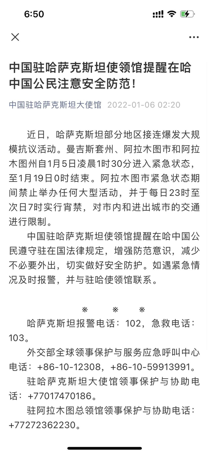 1月6日,中国驻哈萨克斯坦使领馆发布公告,提醒在哈中国公民注意安全防范。网络截图