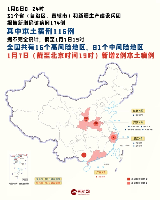 1月6日0-24时,31个省(自治区、直辖市)和新疆生产建设兵团报告新增确诊病例174例。其中本土病例116例(陕西57例,均在西安市;河南56例,其中许昌市28例、郑州市26例、洛阳市1例、固始县1例;浙江3例,其中宁波市2例、金华市1例),含21例由无症状感染者转为确诊病例(河南20例,浙江1例)。