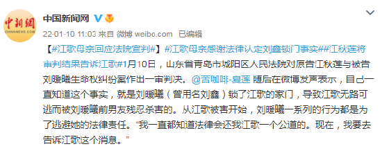 #江歌母亲感谢法律认定刘鑫锁门事实##江秋莲将审判结果告诉江歌#1月10日,山东省青岛市城阳区人民法院对原告江秋莲与被告刘暖曦生命权纠纷案作出一审判决。@苦咖啡-夏莲 随后在微博发声表示,自己一直知道这个事实,就是刘暖曦(曾用名刘鑫)锁了江歌的家门,导致江歌无路可逃而被刘暖曦前男友残忍杀害的。从江歌被害开始,刘暖曦一系列的行为都是为了逃避她的法律责任。“我一直都知道法律会还我江歌一个公道的。现在,我要去告诉江歌这个消息。”