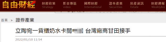 继购买朗姆酒向立陶宛“表达支持”后,又有台湾厂商被爆已经接手立陶宛被中国大陆“卡关”的奶。台湾绿媒《自由时报》10日声称,立陶宛“挺台”遭中国大陆“报复”,立陶宛一货柜奶水被大陆“卡关”,在海上漂流2个多月后,2021年12月底辗转运送来台,台湾新北甘田食品科技公司上周接手近千箱,公司董姓老板大呼“终于有好喝的港式奶茶可卖”,还说将换上结合立陶宛国旗的新包装“挺台”。