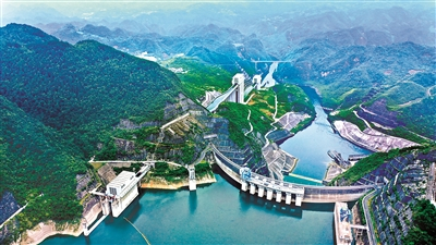 构皮滩水电站通航工程2012年开工建设,历时近10年完工,目前已投入试运行,开始大规模航运。过往船只可通过上下游引航道、三级“超级电梯”和两段中间渠道实现“翻坝”。图为构皮滩水电站大坝及通航工程全景。 (构皮滩通航管理处供图)