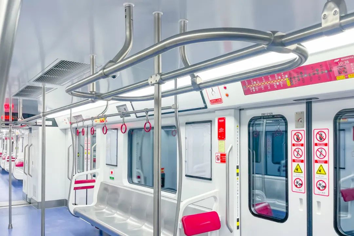 进入站台,可见标识色为“紫红色”的轨道9号线列车,登上列车,在车门口处抬头便可见上方的环形扶手——这是9号线列车车厢内人性化设计之一。