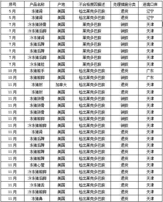 2015年,中国国家质检总局曾公布不合格肉制品名单,显示2014年共有32个国家和地区258批次肉制品被检不合格,其中,29批次的进口冻猪产品检出我国严禁添加的莱克多巴胺,其中美国进口冻猪产品就占据了28批次,加拿大1批次。