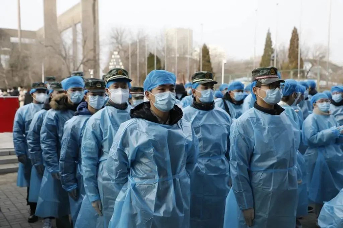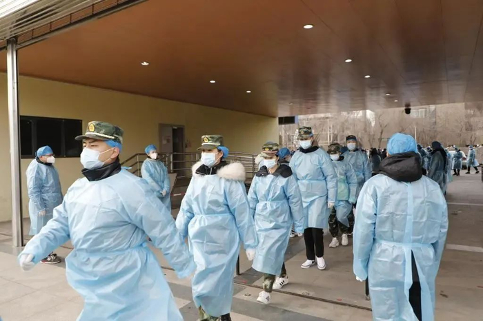 张铜曾经在部队服役两年,现在是天津大学硕士一年级学生,也是天津大学退役士兵协会的成员。协会在1月8日紧急成立防疫服务队,队员们当天晚上就穿着军训服,戴上口罩和防护手套,在核酸检测中担任引导工作。