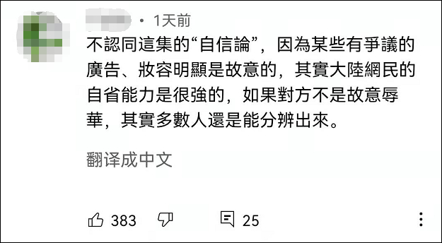 根据节目,大陆网友反对西方审美霸权和刻板印象的行为,首先被这两人“定性”成所谓的“极端民族主义”,并认为这种情绪会给跟大陆交往的对象造成困扰。
