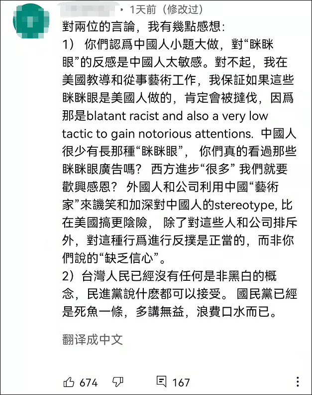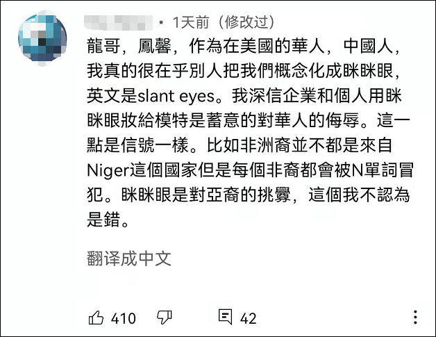 一些在美华人更是直白讲明,企业或个人让模特画“眯眯眼”妆容就是对华裔长相的歧视与侮辱,大陆的排斥是正当的,而非唐湘龙所谓的“缺乏信心”。他们也会在乎被概念化成“眯眯眼”,因此“很高兴有强大的中国大声呛回去”。