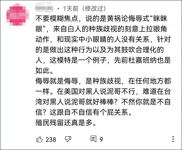 他们纠正唐湘龙混淆概念的说法,指出某些品牌的广告涉嫌故意展示、固化西方对华人“眯眯眼”的刻板印象,“值得抵制、抗议”。对唐湘龙,他们直批其“虚伪”,点明他“把恶意的‘辱华’事件当成中国人的不自信”完全就是模糊焦点,弄错了对象。