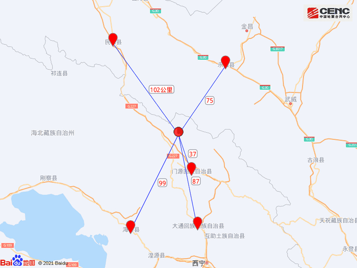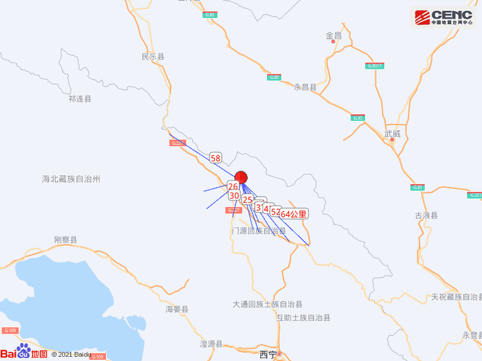 周边县城:震中距门源回族自治县35公里、距甘肃永昌县75公里、距大通回族土族自治县87公里、距海晏县99公里、距甘肃民乐县102公里,距海北藏族自治州97公里,距西宁市122公里。