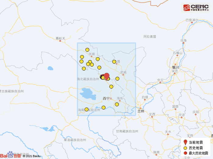 历史地震:根据中国地震台网速报目录,震中周边200公里内近5年来发生3级以上地震共35次,最大地震是2022年1月8日在青海海北州门源县发生的6.9级地震(距离本次震中22公里),历史地震分布如图。