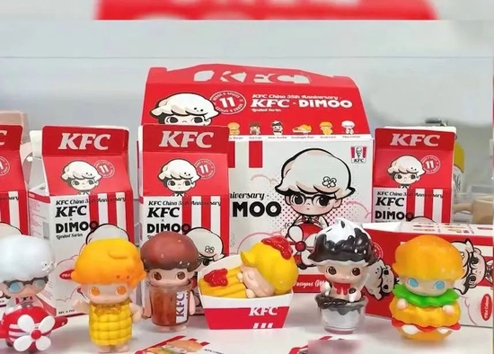 1月4日,肯德基和盲盒品牌泡泡玛特联动,推出联名套餐,内含DIMOO盲盒一个。官方配文也很吊人胃口: