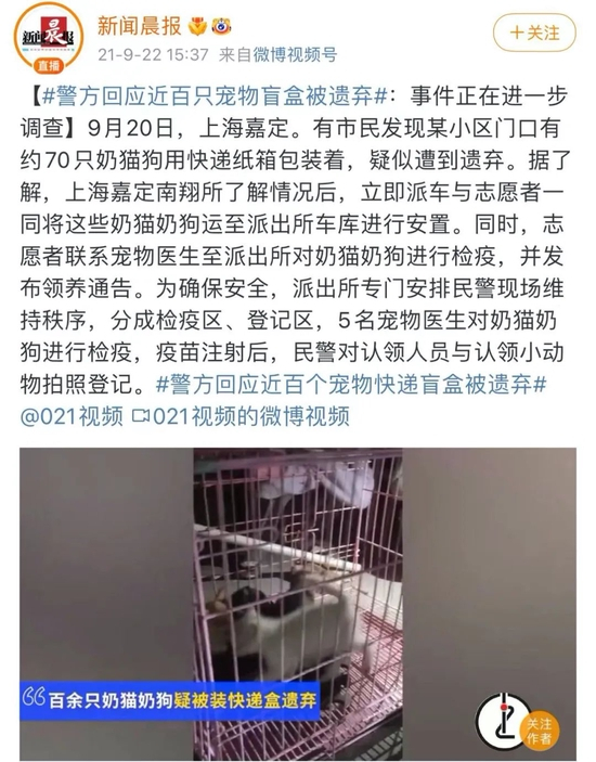 2021年,上海嘉定区乐惠路某小区门口发现大量活体宠物盲盒,上百只奶猫奶狗被装在纸箱覆盖的笼子里,瑟瑟发抖、哀嚎不止。这批宠物盲盒被发现时,已有不少动物死亡,令人触目惊心。