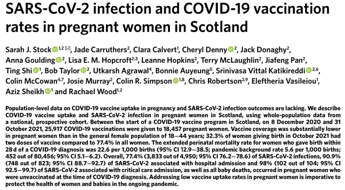 为决绝孕期接种新冠疫苗及感染新冠病毒的数据较为缺乏的问题,Stock等人分析了“苏格兰妊娠期新冠研究”(COPS)收集的数据,该研究是一项全国性的队列研究,研究对象包含所有在2020年3月1日及之后怀孕的女性,并与新冠感染和新冠疫苗接种数据交叉关联。