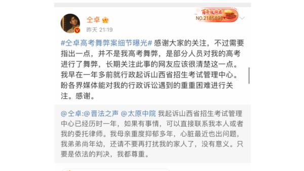 此前有消息称,2021年4月22日,太原市中级人民法院对原告仝卓诉被告山西省招生考试管理中心作出的《国家教育考试考生违规处理决定书》一案公开开庭进行审理。原被告代理人及行政机关负责人参加了庭审,双方充分发表诉辩意见,对证据进行举证质证,案件将择日宣判。