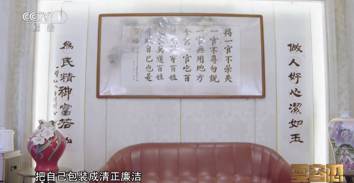 [解说词]有意思的是,别墅客厅里满墙挂的文字,都在标榜自己心系百姓、淡泊名利。中间挂的是康熙年间一位知县的名言:“得一官不荣,失一官不辱,勿说一官无用,地方全靠一官;吃百姓之饭,穿百姓之衣,莫道百姓可欺,自己也是百姓。”两侧挂的是一名老板送给王富玉的一副对联:“做人好心洁如玉,为民精神富若仙”,煞费苦心地将“富玉”二字藏在对联中,对王富玉奉承吹捧。墙上文字和豪华别墅的反差,恰是王富玉“两面人”做派的生动写照。
