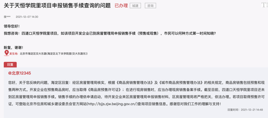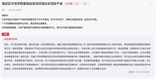 对此海淀区方面回复:“截至目前,四道口天恒学院里项目还未到区房管局申报销售手续(预售或现售),销售手续的办理依企业申请启动,待开发企业来区房管局申报销售材料后,区房管局将严格把关,依法办理。关于市民提及的商品房已内部预订的问题,区房管局高度重视,经与开发企业北京恒海天诚房地产有限公司沟通,并无此情况。”