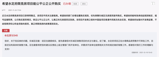 2021年11月,有市民在领导留言板中说:“近日永定府限竞房项目已获得预售证,该项目市民关注度极高。希望政府部门合理设置购买规则,优先保障东城区无房居民摇号购买。”
