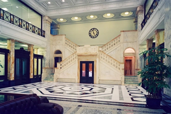 大楼营业大厅呈长方形,四周有28根大理石饰面的爱奥尼克式柱子。大厅中央为高13.2m的拱形玻璃天棚,天棚南北两端各有两根由整根大理石雕成的爱奥尼克式装饰圆柱。