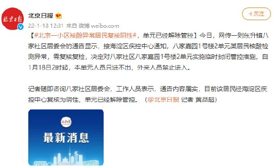 原标题:北京一小区核酸异常居民复核阴性,单元已经解除管控