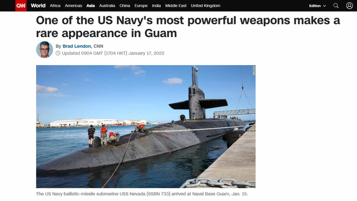 当地时间1月17日,搭载了20枚“三叉戟”弹道导弹和数十枚核弹头的俄亥俄级战略核潜艇“内华达”号现身美军关岛基地。这是自2016年以来,美军战略核潜艇首现关岛。