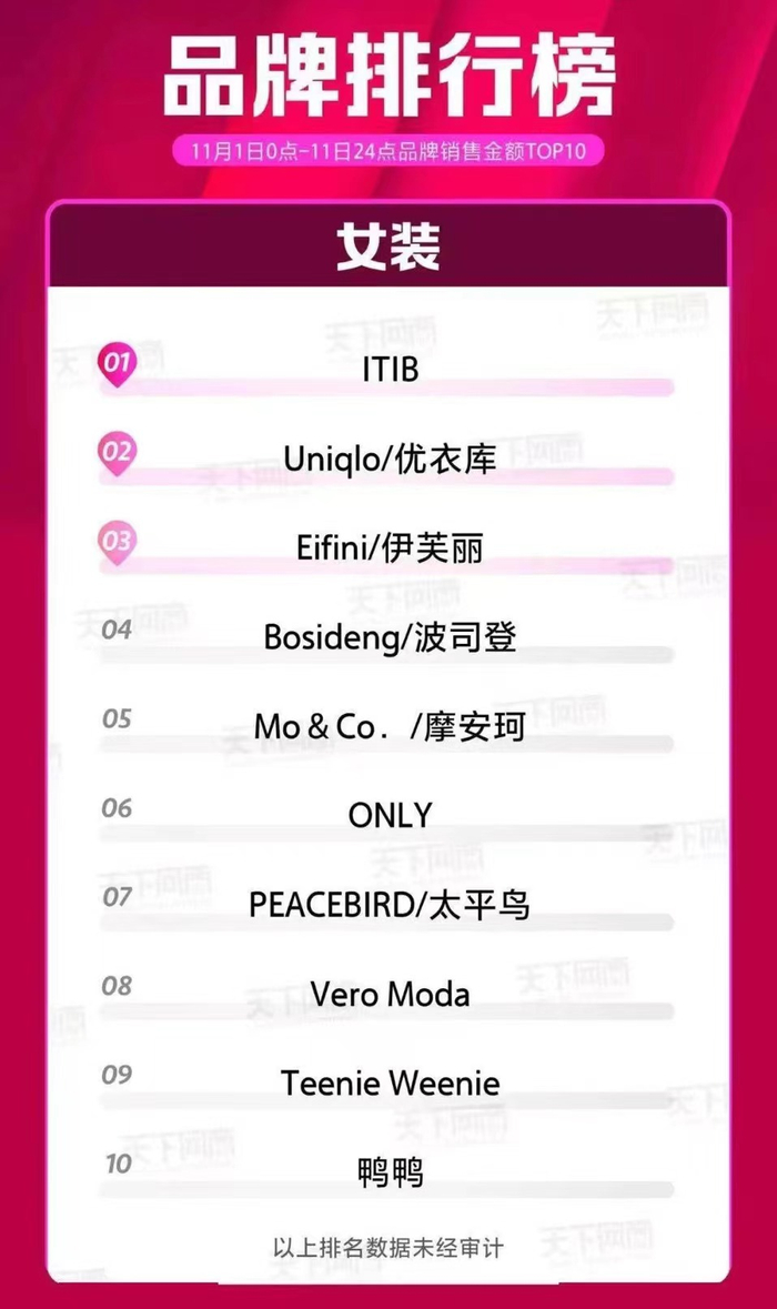 天猫商城数据显示,汇聚了100多位优秀的独立设计师的ITIb,双十一期间成为女装类目销量“榜一”,天猫品牌旗舰店总支付件数超345万件,超越了传统品牌优衣库和波司登。