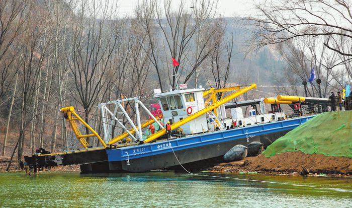 1月19日下午,三门峡市湖滨区高庙乡小安村的黄河护岸工程处,一艘45米长的拼装式绞吸挖泥船缓缓驶入黄河,开始执行三门峡库区清淤试验任务。