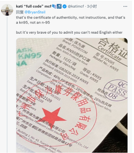 “这是合格证明,不是说明书,这是KN95,不是N-95。但你还承认你不懂英语,真是太勇敢了”。