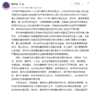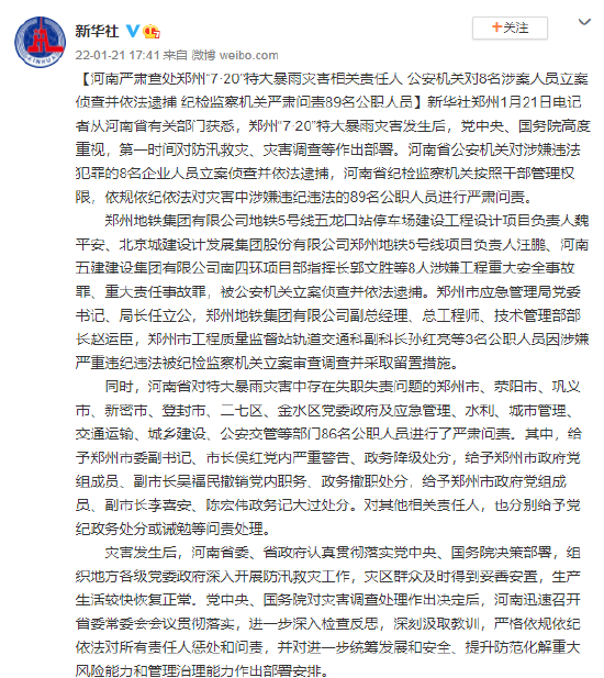 新华社郑州1月21日电记者从河南省有关部门获悉,郑州“7·20”特大暴雨灾害发生后,党中央、国务院高度重视,第一时间对防汛救灾、灾害调查等作出部署。河南省公安机关对涉嫌违法犯罪的8名企业人员立案侦查并依法逮捕,河南省纪检监察机关按照干部管理权限,依规依纪依法对灾害中涉嫌违纪违法的89名公职人员进行严肃问责。