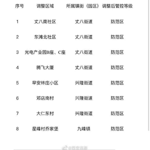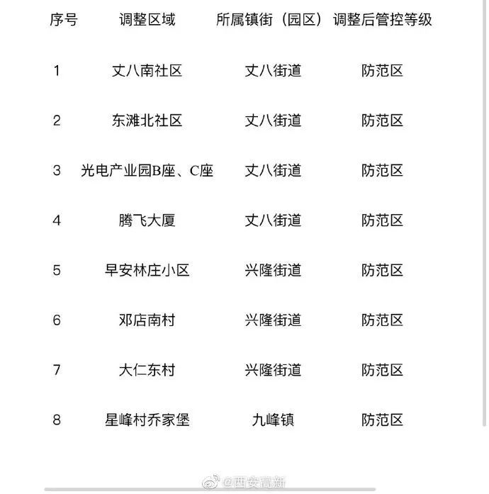 按照国务院联防联控机制和省、市关于新冠肺炎疫情社区防控工作要求,结合西安高新区疫情防控形势,经高新区新冠肺炎疫情防控指挥部研判,报市疫情防控指挥部备案同意,决定自2022年1月23日起,对部分区域进行调整管理,具体如下:将丈八街道丈八南社区等3个镇街的8个小区村、楼栋调整为防范区(具体名单见下表)。
