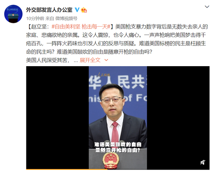 【赵立坚:#自由美利坚 枪击每一天#】美国枪支暴力数字背后是无数失去亲人的家庭、悲痛欲绝的亲属。这令人震惊,也令人痛心。一声声枪响把美国梦击得千疮百孔,一阵阵火药味也引发人们的反思与质疑。难道美国标榜的民主是枉顾生命的民主吗?难道美国鼓吹的自由是随意开枪的自由吗?
